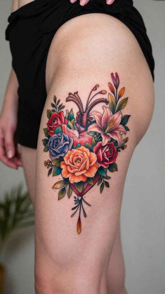 This fusion allows for personalization through elements like dates or names, turning the tattoo into a cherished testament to love or special memories. The combination of flowers and hearts creates a classic expression of affection.
