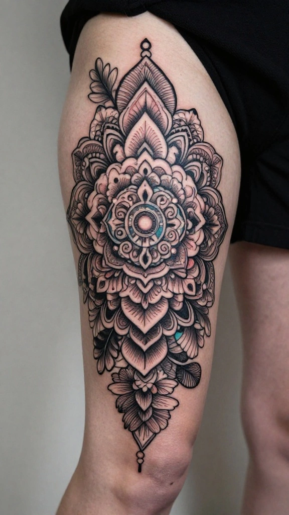 Mandala tattoos are visually captivating and carry deep meanings of balance and harmony. An intricate mandala on your thigh can serve as a stunning focal point, showcasing symmetrical patterns and detailed line work that draws the eye. Many women choose this design not just for its beauty but also for its spiritual significance, reflecting personal journeys and inner peace.