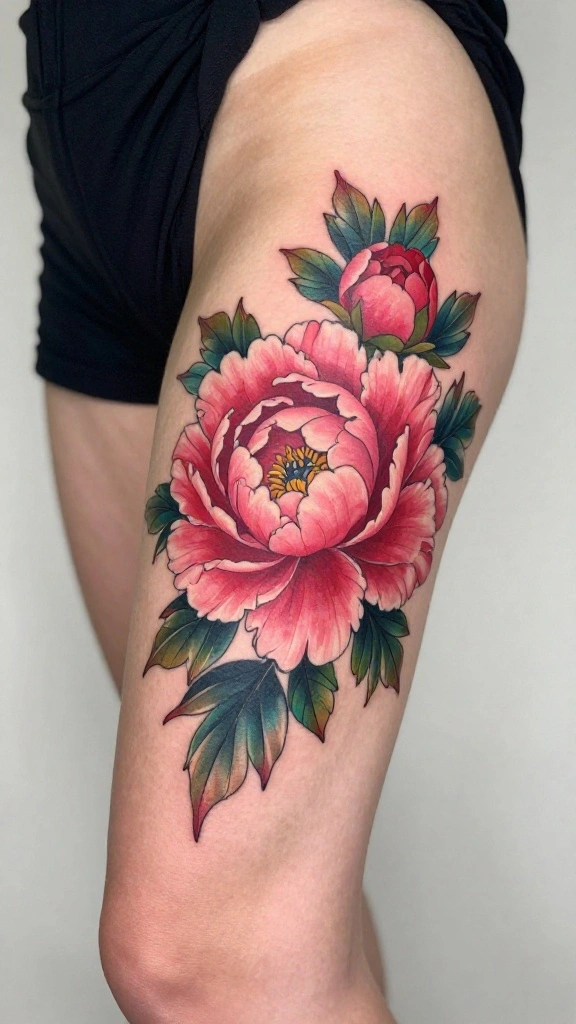 Bold peony tattoos are not just visually stunning; they also symbolize romance, prosperity, and good luck. A peony tattoo on your thigh can create a powerful statement with its vibrant colors and lush petals. Women love these designs for their beauty and the positive emotions they evoke, making it a perfect choice for a meaningful tattoo.