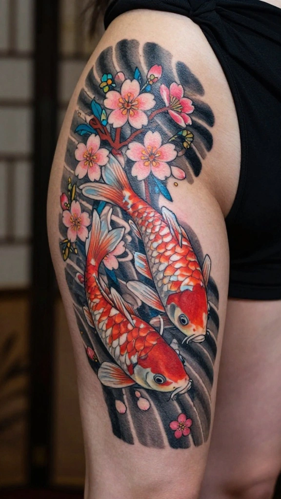 Japanese style tattoos offer a rich tradition filled with meaning, often featuring elements like koi fish, cherry blossoms, and waves. A thigh tattoo that incorporates these aspects can be both beautiful and symbolic, representing concepts such as perseverance and the fleeting nature of life.