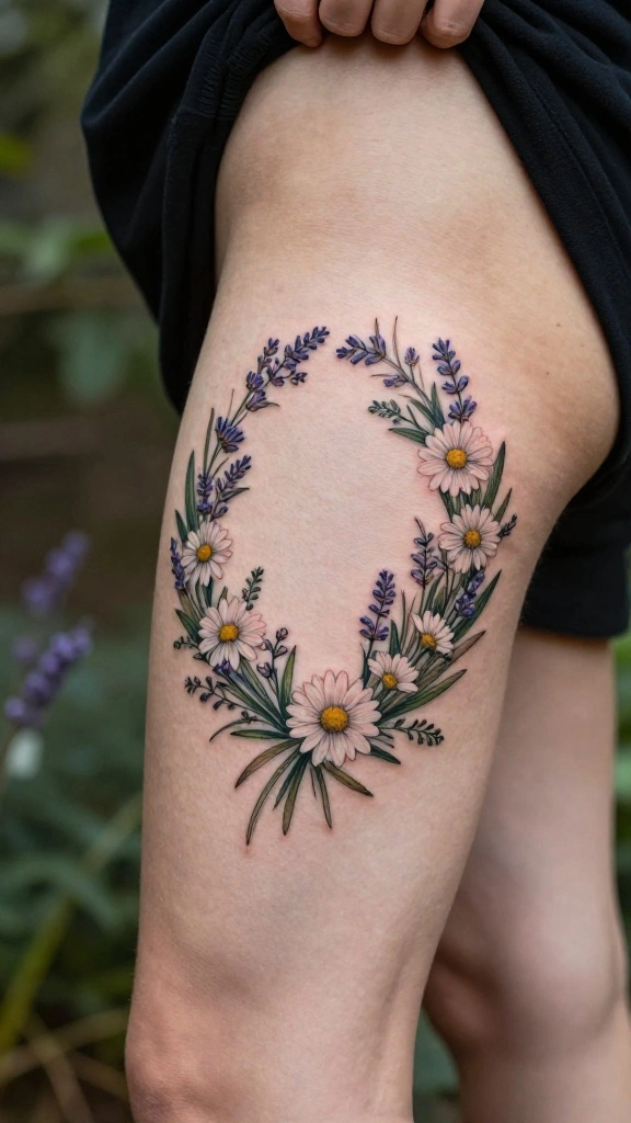 Floral wreath tattoos beautifully encapsulate nature’s beauty in a circular arrangement that symbolizes eternity. These designs often feature an array of flowers and leaves, with the option to include symbols or initials in the center for a personal touch. Women find these tattoos appealing for their versatility and the opportunity to create a unique representation of their personality.