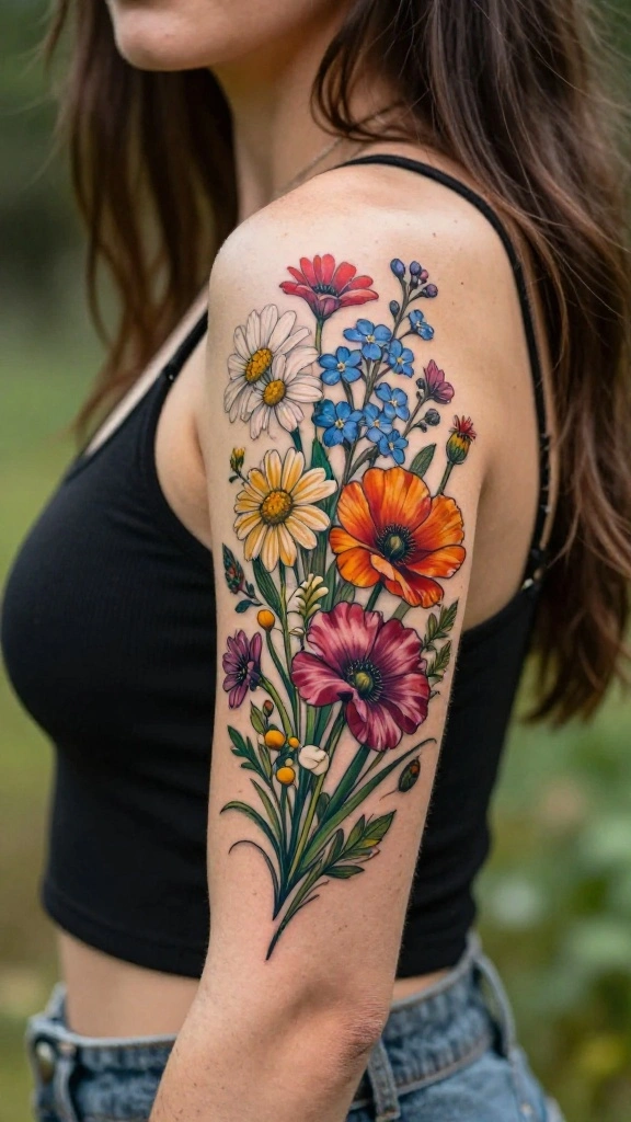 Consider adding a soft watercolor effect to enhance the playful nature of the wildflowers, making your tattoo even more vibrant.