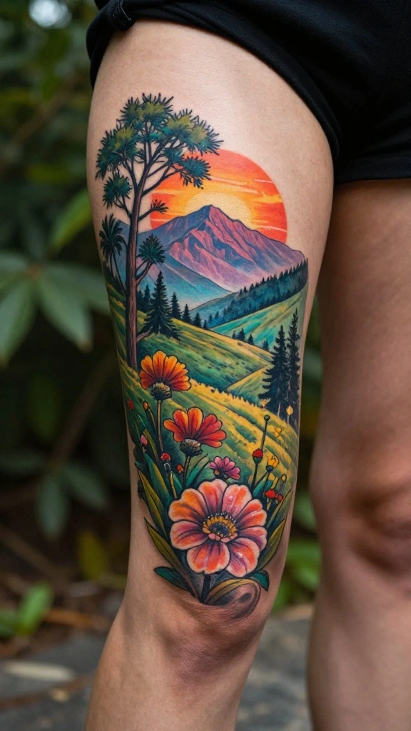 Capture the essence of the outdoors with a full nature scene tattoo that showcases flowers, trees, mountains, or sunsets. This design reflects your love for nature and adventure in a vibrant, detailed way.