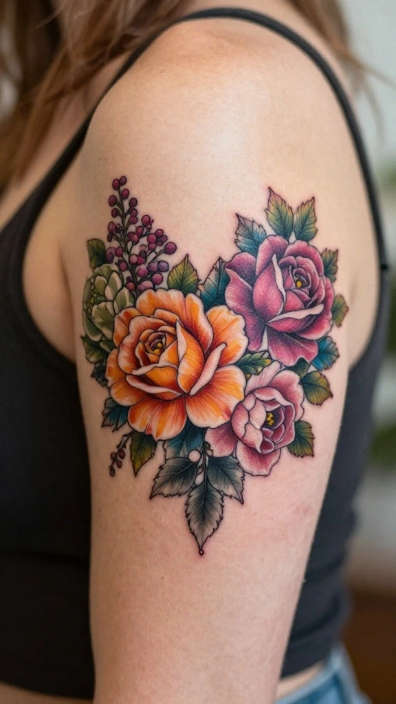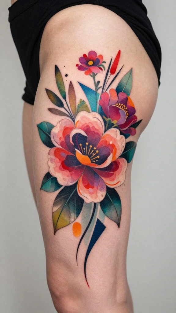 If you’re drawn to vibrant colors and fluid designs, a watercolor floral burst could be just what you need. This tattoo style mimics the artistry of a painting, showcasing a beautiful blend of colors that seem to dance across your skin. It’s more than just floral art; it’s a visual representation of emotions and memories captured in a stunning palette.