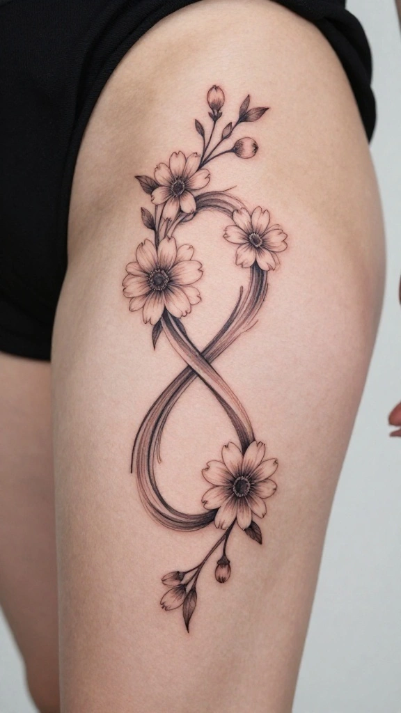 An infinity symbol intertwined with flowers represents eternal love or friendship. This design embodies unbreakable bonds and the beauty of life’s journey.