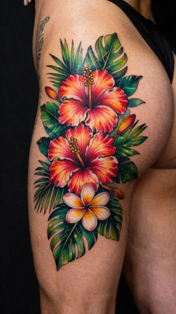 Infuse a bit of tropical flair into your body art with a tropical floral tattoo. This design can feature lively flowers like hibiscus, plumeria, or palm leaves, creating a vibrant and cheerful look.