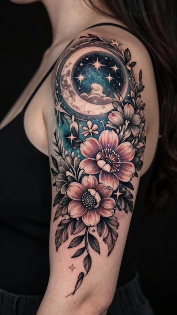 A celestial floral tattoo merges flowers with celestial elements like stars and moons, creating a mystical vibe. This design symbolizes the connection between earth and the cosmos, offering a unique blend of nature and the universe.