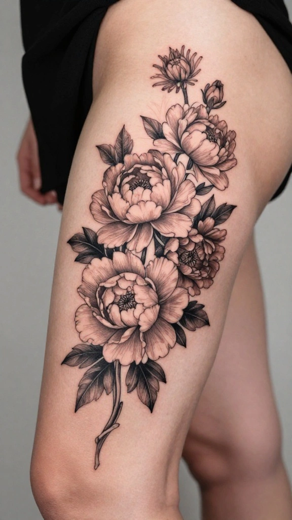If you already have a sleeve tattoo, a floral thigh piece can beautifully extend your existing artwork. This design can seamlessly blend with the current tattoos, creating a cohesive look. Flowers like peonies or chrysanthemums can enhance the overall beauty and significance of your sleeve.