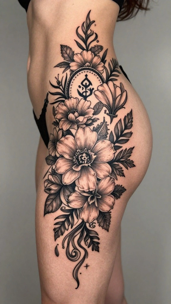 Floral designs are not just pretty—they’re loaded with symbolism you can personalize. A lotus can represent rebirth and purity, cherry blossoms signal transient beauty, roses stand for love, and peonies hint at prosperity and honor. You could weave a small bouquet that encircles the thigh for thigh tattoo inspiration for women, or pair a meaningful bloom with initials or a date for a truly personal piece. If you love floral thigh tattoos for women, think about the meaning behind each flower and how you want it to resonate with your life journey.