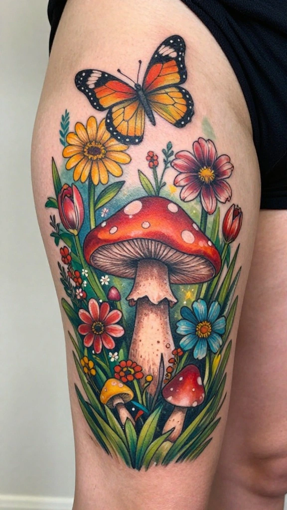 Bring a touch of magic to your body art with a whimsical fairy garden tattoo that sprawls across your thigh. This design can incorporate flowers, mushrooms, and enchanting fairies, creating a delightful blend of nature and fantasy.