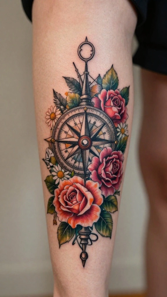 Merge the beauty of nature with adventure through a floral compass tattoo. This design typically features a compass surrounded by vibrant flowers, symbolizing guidance along life’s journey. It’s ideal for those who view life as an adventure and wish to carry that sentiment with them.