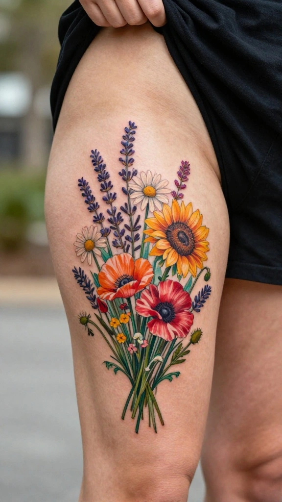 Imagine a beautiful arrangement of wildflowers gently cascading around your thigh, bringing nature’s charm to your skin. This tattoo design captures the essence of wildflowers, representing the beauty found in life’s unpredictable moments. You can choose specific flowers that resonate with personal memories, creating a unique garden just for you.