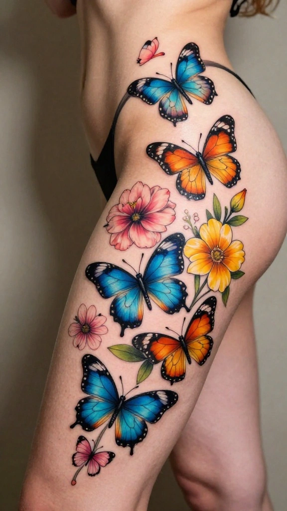 Butterflies symbolize transformation and beauty, making them a perfect addition to floral thigh tattoos. A design that intertwines butterflies with blooming flowers creates a dynamic and flowing look. The butterflies can be depicted in flight among the flowers, representing freedom and growth, making this tattoo deeply meaningful.
