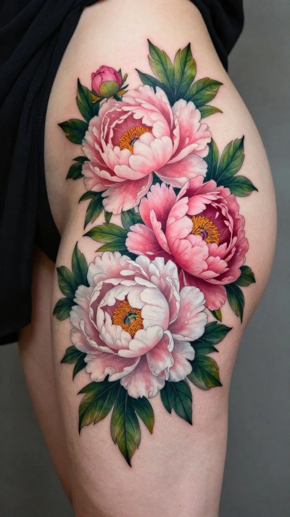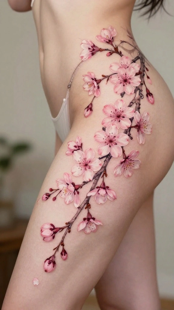 For your design, consider using varying shades of pink to create depth and dimension. Including branches can help the tattoo flow naturally along your thigh’s curves, while pairing with butterflies or birds can enhance the overall composition.