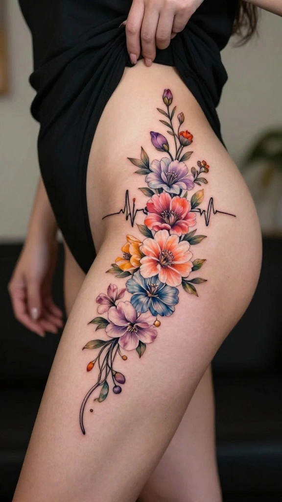 Watercolor tattoos embrace creativity and artistic expression, making them perfect for floral thigh designs. This style allows for a vibrant burst of colors, as flowers blend together like a painter’s brushstrokes. A watercolor floral tattoo can wrap around your thigh, symbolizing joy and excitement in life.