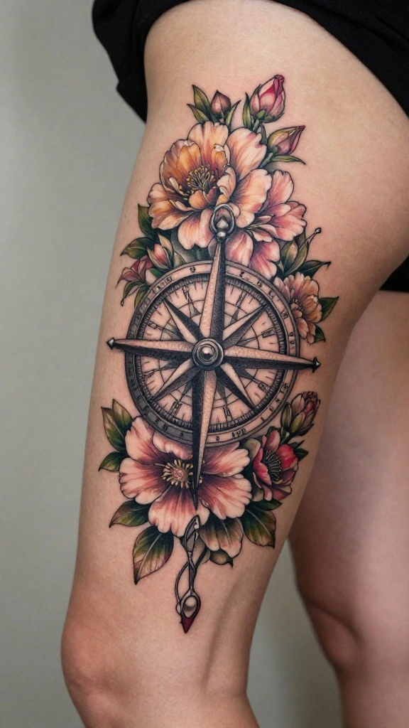 A floral compass tattoo symbolizes direction and purpose, making it an inspiring choice for a thigh tattoo. This design can wrap around your thigh, with flowers framing the compass, representing beauty amidst guidance. The compass signifies finding one’s path in life while flowers add femininity and grace.