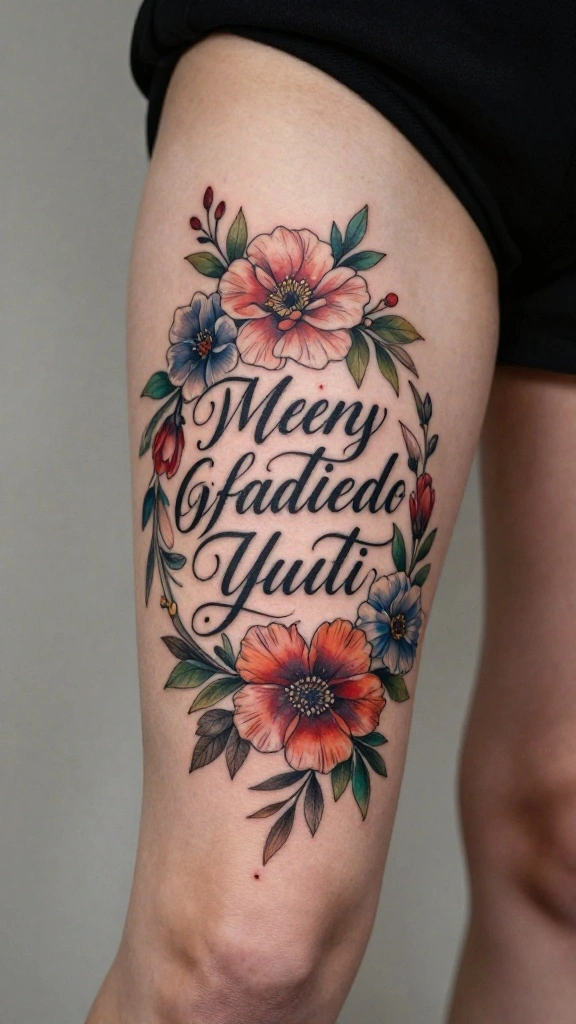 Incorporating a quote with floral designs creates a powerful and personalized thigh tattoo. This design can wrap around your thigh, with flowers framing your favorite words or phrases, blending meaningful text with natural beauty. It’s a wonderful way to express your beliefs and inspirations while adding a creative floral touch.