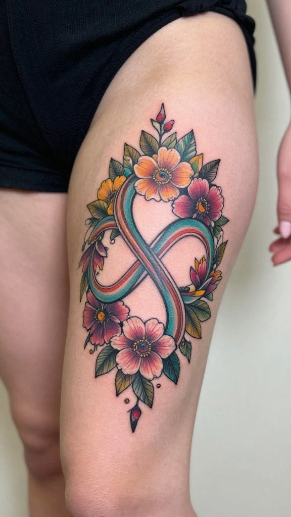 An infinity symbol intertwined with floral designs represents eternal love and life, making it a profound choice for a thigh tattoo. This design can wrap around your thigh, with flowers blooming around the infinity symbol, symbolizing the endless cycle of beauty and love. It’s a beautiful way to celebrate relationships, memories, or personal values.