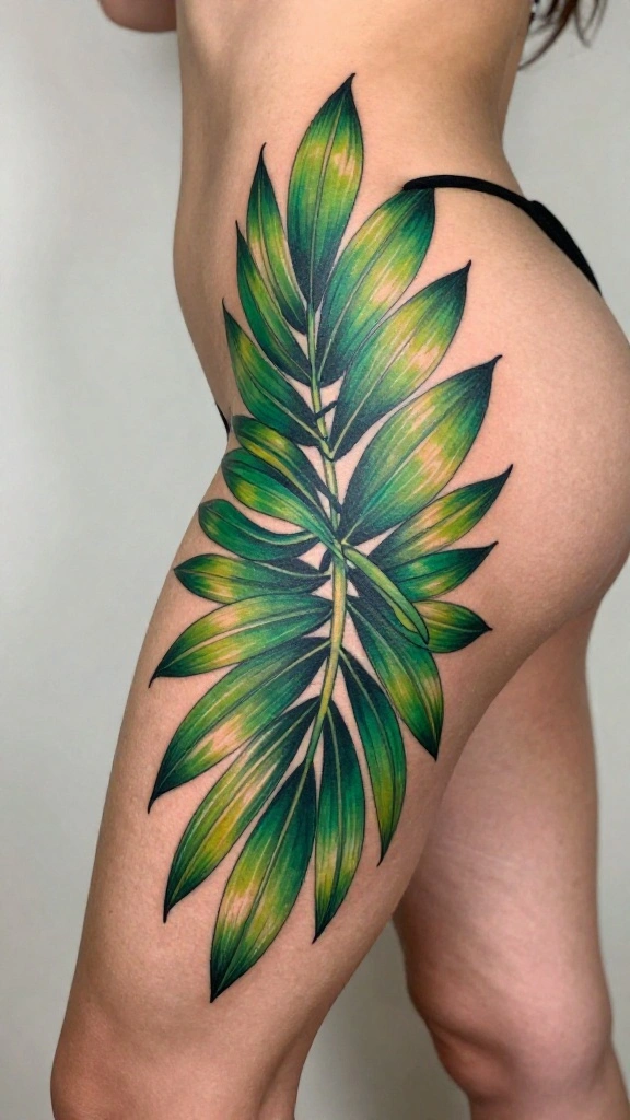 Palm leaves bring a tropical vibe, making them a lively choice for a thigh tattoo. These designs can wrap around your thigh, mimicking the movement of leaves in the breeze. Whether you choose vibrant colors or a monochrome style, palm leaves offer a versatile look that suits any personal aesthetic.
