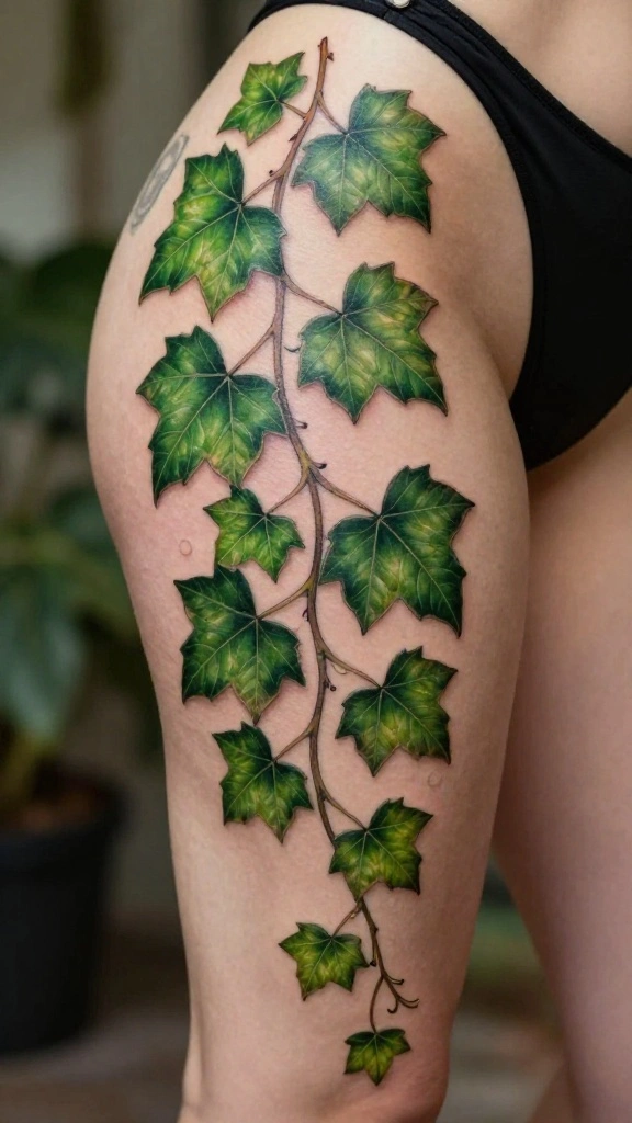 Ivy and vines create a beautifully flowing thigh tattoo that symbolizes growth and strength. This design can spiral around your thigh, mirroring nature’s resilience and beauty. Ivy is particularly meaningful, representing fidelity and eternal love, making it a thoughtful choice for personal values.