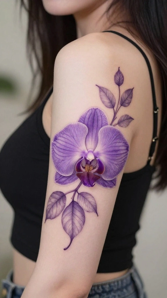 Consider selecting colors that resonate with you, such as vibrant purple or delicate white. Adding elements like leaves or vines can enhance the design’s depth and appeal. Work closely with your tattoo artist to ensure the orchid stands out beautifully.