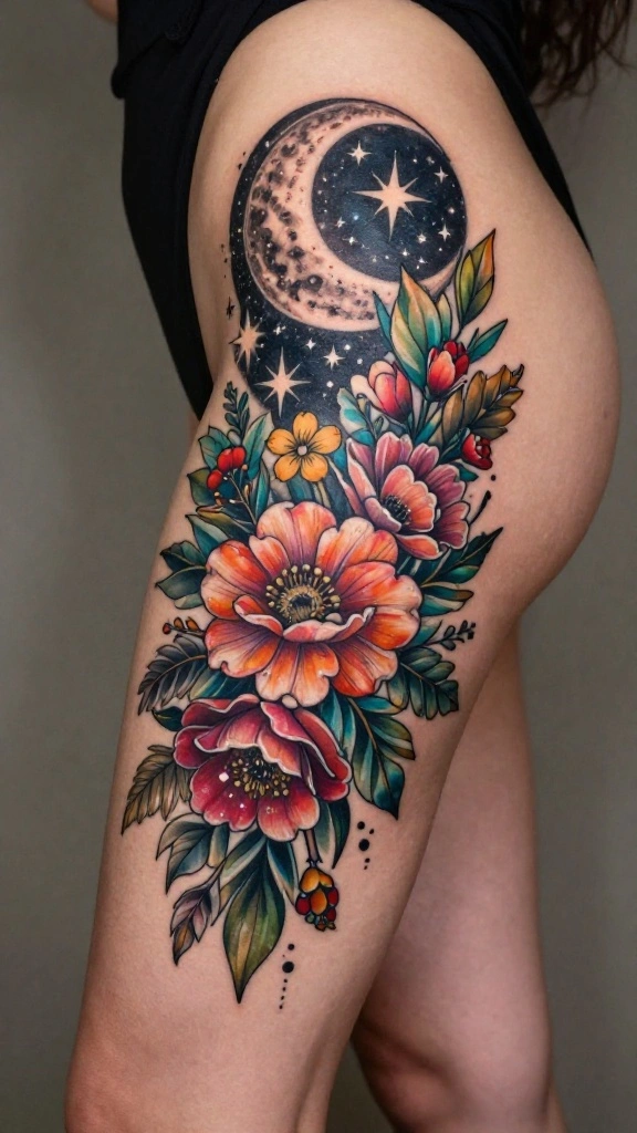 Consider a design with delicate flowers intertwined with starry constellations or crescent moons, creating a unique blend of beauty and magic. You can use vibrant colors for flowers contrasted with darker hues for celestial elements.