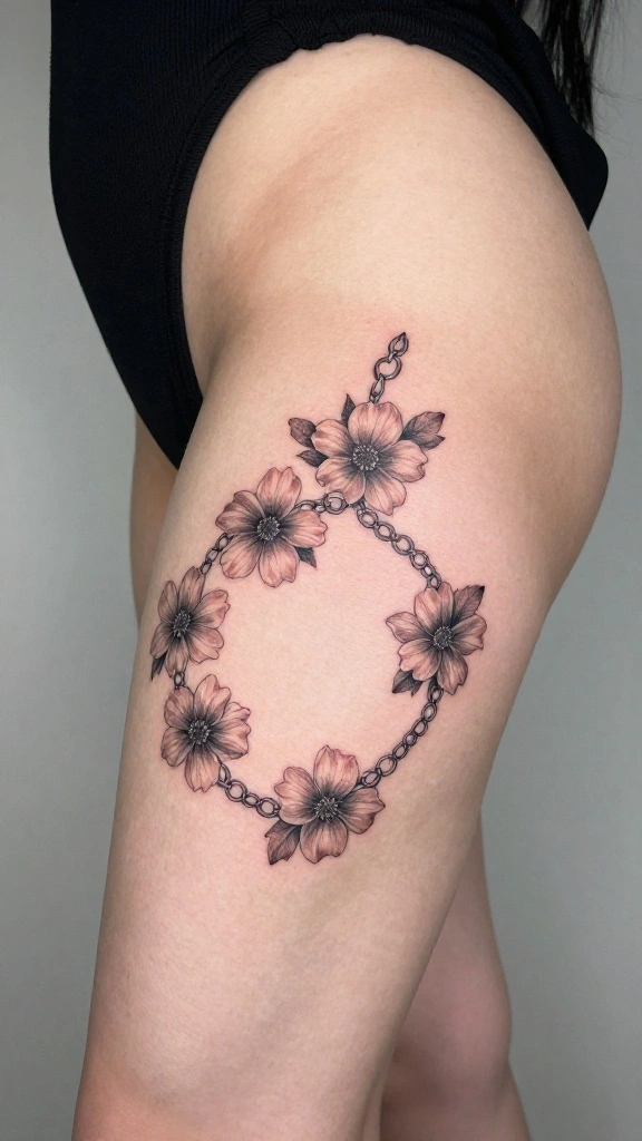 Are you searching for a delicate and feminine tattoo design? A flower chain tattoo wraps gracefully around the thigh, featuring various flowers linked together in a continuous flow. This symbolizes unity and connection beautifully.