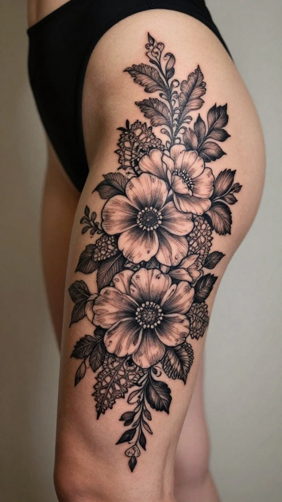 Do you desire a sophisticated and elegant tattoo? Integrating floral designs with lace patterns creates a stunning thigh tattoo. This style combines the delicacy of flowers with intricate lace details for a beautiful feminine aesthetic.