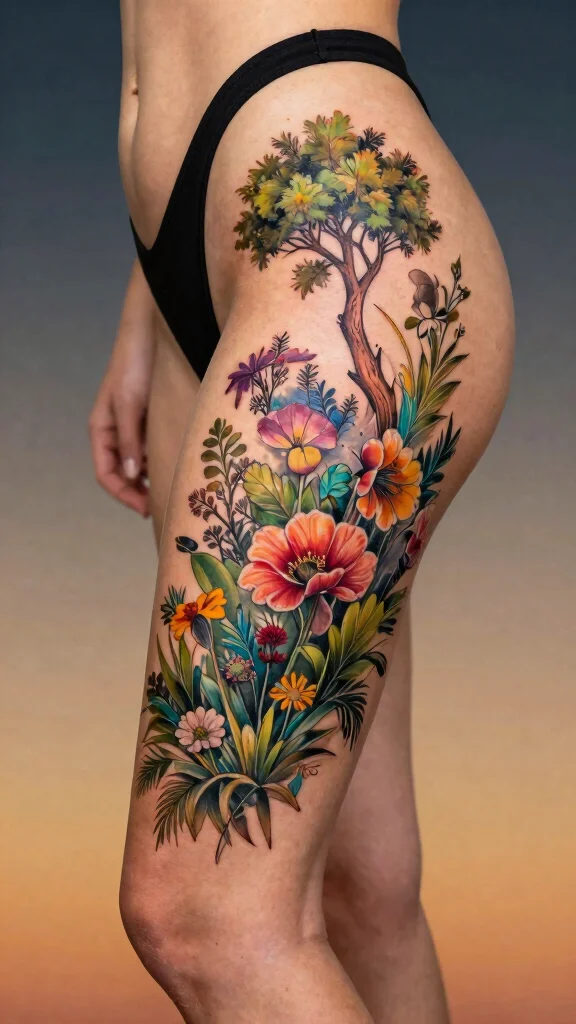 Are you inspired by the beauty of nature? A nature-inspired scene using floral elements can result in a breathtaking thigh tattoo. This design can depict a beautiful garden or serene setting, incorporating various flowers, trees, and other natural elements.