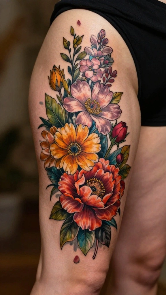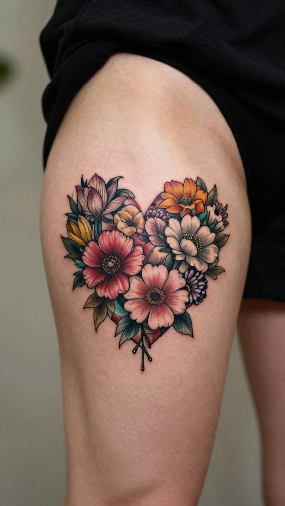 Positioning this tattoo on your thigh creates a striking visual while conveying deep meaning. You can choose flowers that resonate with you, whether roses for love or daisies for purity. This design can be vibrant or soft, depending on your style.
