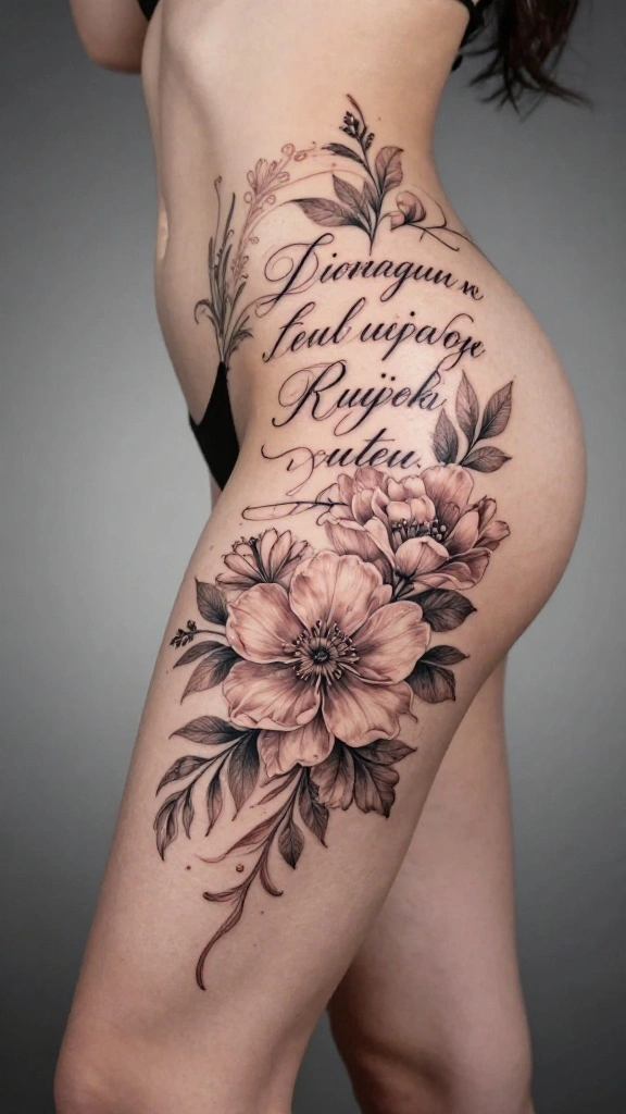 Are you inspired by words and nature? Incorporating a meaningful quote with floral designs can create a powerful thigh tattoo. The combination of flowers and words symbolizes personal beliefs, memories, or inspirations beautifully.