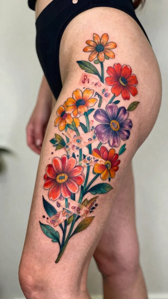 Do you want a playful and creative tattoo? Floral tape designs mimic the look of flowers wrapped with decorative tape, creating a unique thigh tattoo. This design showcases beauty while adding artsy flair.