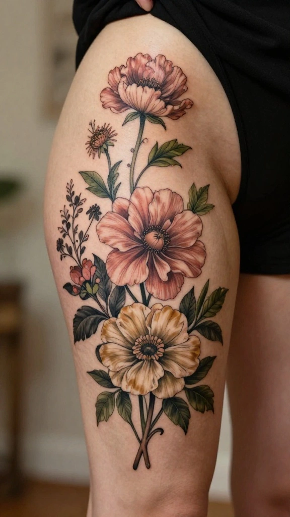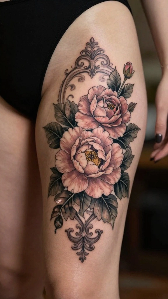 A vintage floral thigh tattoo could include roses, peonies, or other elements that evoke romance. Soft pastels and muted tones create a faded look, embodying the essence of vintage artistry. Combining these flowers with ornamental details enhances the elegance of your design.