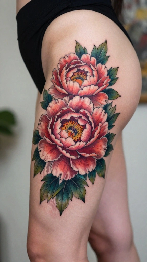 Are you ready to make a statement with your tattoo? Peonies symbolize prosperity and romance, making them a bold choice for thigh tattoos. These stunning, large blossoms can create a captivating focal point on your leg.