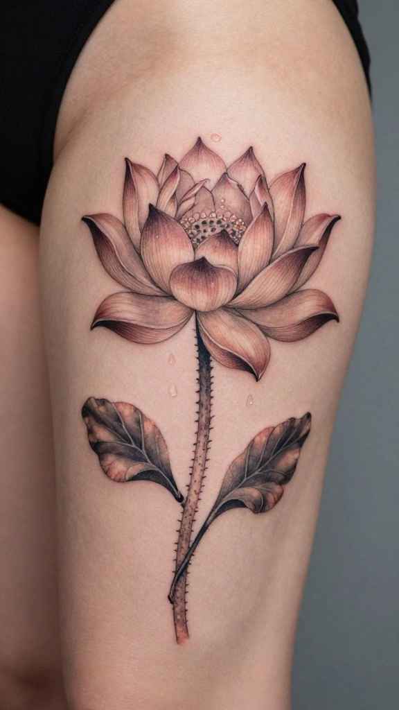 Are you looking for a tattoo that symbolizes personal growth and beauty? The lotus flower is a powerful choice for a thigh tattoo, representing purity and spiritual awakening. Positioned on your thigh, it symbolizes overcoming challenges, blooming beautifully above muddy waters.