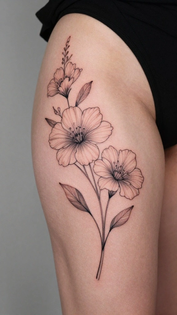 A minimalistic design on your thigh can be incredibly elegant and timeless. These tattoos work beautifully in black ink or can be enhanced with soft colors. The beauty of minimalistic tattoos lies in their personalizability based on your favorite flowers.