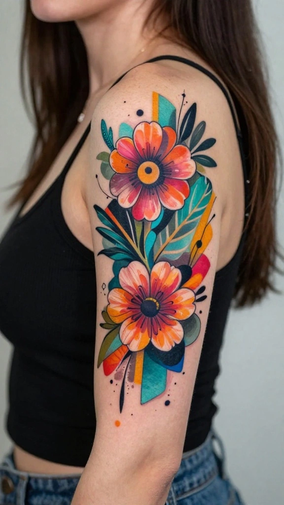 Are you ready to explore a modern twist on floral designs? Abstract floral tattoos allow for creativity by combining flowers with various shapes and colors. This style creates eye-catching compositions that convey emotions and artistic expression.